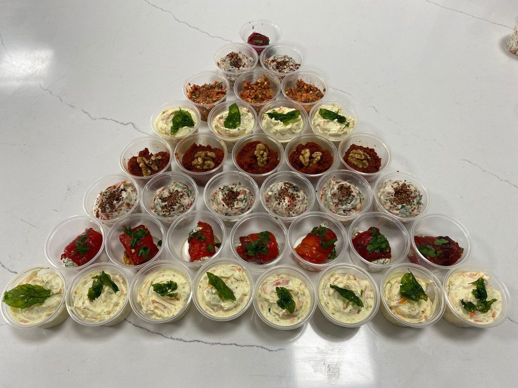 Közlenmiş biber, süzme yoğurt, kornişon turşu, susam, maydanoz, dereotu, mayonez.